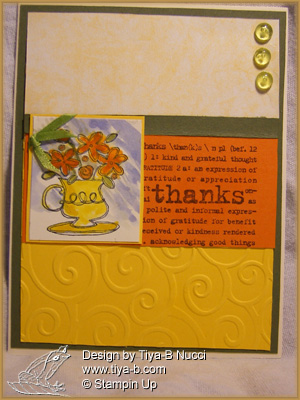 This is for my daughter, she gave me a beautiful handmade cup for mothers day- so the cup is on the thank you. The sets for the cup and thanks stamps are stampin up. the bottom background is cuttlebug swirls.