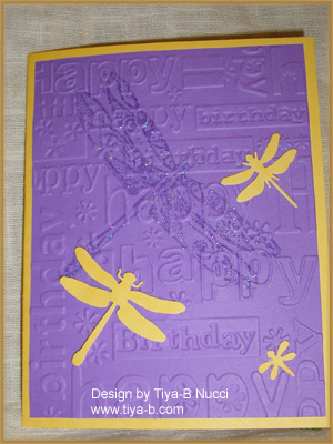 The card is mostly cuttlebug birthday background with a dragon fly stamp embossed( before applying the cuttlebug and several punched yellow dragonflies.