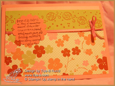 I like this card design the words are A stamp in the hand, the beetles are a stampin’ up wheel and I dont know whre the paper came from.