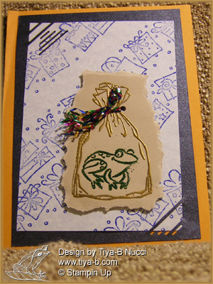 The bag is tied with a bow. its from a Stampin’ up set all wrapped up. it has fishes, flowers jelley beans that can be in the bag but i mostly think of frogs.