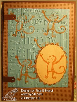 The background is cuttlebug folder with stamped monkeys. the oval is cut with spellbinder ovals plain and scalloped. Window punch is used for the brown side attachments.