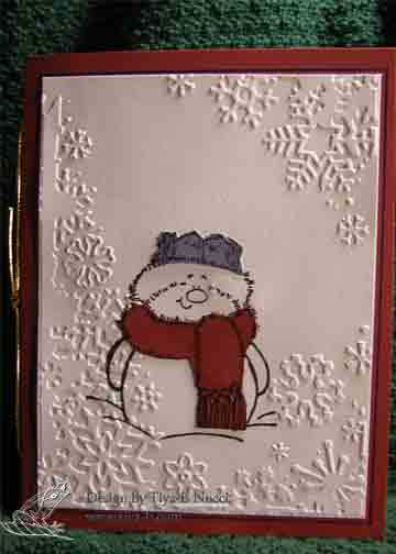the hat and scarf are cut out- paper pieced and the snow flakes are cuttlebuged onto the card after it was stamped.