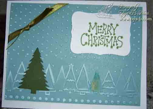 I’m having fun playing with my cuttlebug and punches… the tree is Martha Stewart and the trees and snow are two cuttlebugs… the trees and snowdots above them weren’t enough so i added the swiss dot cuttlebug, then sanded the trees and snow to turn it form the outside to the paper core white.  then spellbinder title box with Merry Christmas was added.