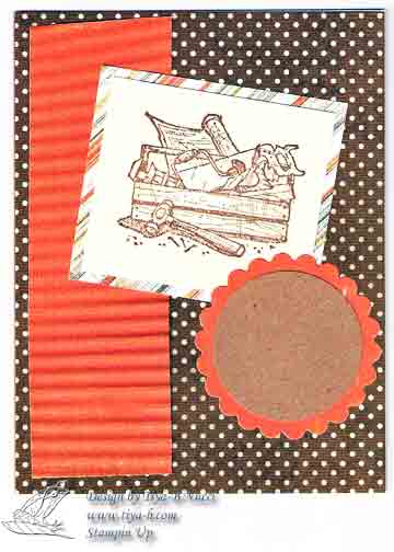 The Stampin’ Royality challenge is a masculine card and sometimes i just am too obvious so i had to do tools, the tools are stampin’ up. i crimped the orange strip and cut the circles with spellbinders die cuts.