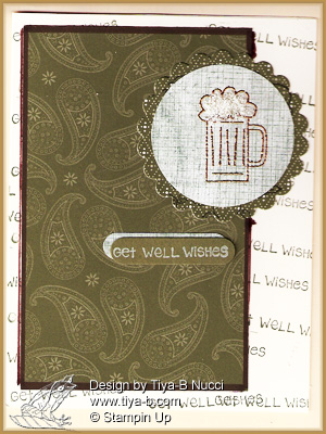 Steve just had surgery and since he’s a brewer, (his hobby is brewing beer). I choose to emboss a frothy mug . The foam was filled in using flower soft! The stamps as well as the green background papers are Stampin’ up, the foam is flower soft, the scallop circle is cut with a spell binder die. the background paper is as well as the scallop are Stampin’ up papers.