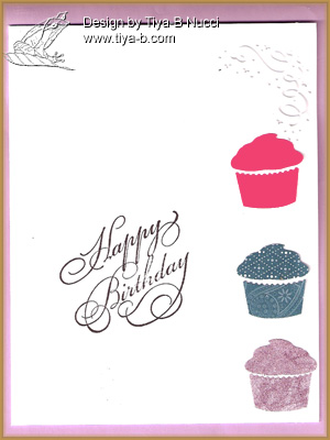 The Stampin’ Royality challenge was purple, pink, turquoise and black, and birthday cards are always handy… iI embossed a cuttlebug swirl and added a stampin up happy birthday…. cupcakes are so in so i cut 3 out with a martha stewart punch…