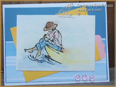 Here’s mojo monday template, but I’m still thinking about the Penny black challenge to do something vacation summery and thought of this stamp but it wasn’t pb so i did a summer theme with a Penny black masked on top of another stamp. Today I’ll use the summer stamp i was thinking about for Mojo Monday. It’s from Stampin’ up’s ‘Summer by the sea’, i bet the stamp thought it would never be used since Ive owned it for several years and today is the day. As my usual coloring is chalk and the pink squigle is a nestie spellbinder cut.