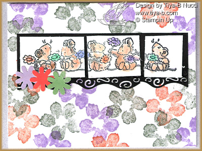 How about another 3 challenges, cupcake inspirations(green purple orange flowers), Skipping stone design – sketch and Stampin B’s -use stamps instead of background paper. the background flowers are from a Stampin up set. The mice and flowers image is from Penny black.