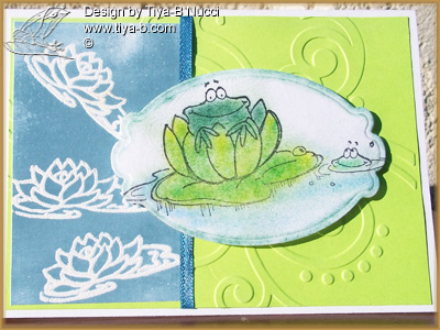 it’s a bright Saturday morning and here I am making frog cards, how strange, and I worked this frog for 4 challenges Marks Finest Papers resist, Penny Black flowers- although you can’t see it I know water lilies have flowers, Stampin B’s blue and green and Play Date Cafe blue, blue and green. The frog and daughter image is from Penny Black and the ‘flower ‘stamp for the resist is from Marks Finest Papers pond set. I stamped the frogs chalked the images and framed them with a nestie cut/emboss, then cuttl bugged the lime paper with a swirl design and then embossed white water lilies on glossy paper then bayered it in blue- put them all together and added a ribbon between the resist and embossed background layer.