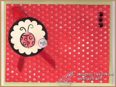 This is for two challenges the lady bug is from Cupcake Inspirations see below. I used a Ribbon , 3 red Rhinestones and a little Round thank you from Joann essential and the challenge Crafts for Eternity– is embellishments beginning with R. The ladybug image is Stampin up, the red background is cuttlebuged and i usedpunches for the flower and black circle.