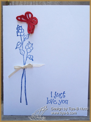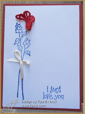 The theme of Less is More challenge is COLOURS of YOUR NATION’S FLAG. My flag is Red white and blue … so I stamped a blue flower & sentiment, added a red butterfly and then tied a white ribbon ‘around the stems’. The stamps are Stampin’ up the layered butterfly is Martha Stewart punch. I couldnt leave this alone so i cut it down and added a red border. i think it adds a lot but am worried that that makes this more is more.