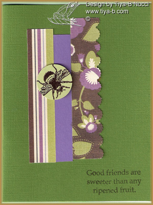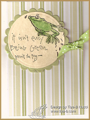 I know its not Kermit… the stamp is one of Penny blacks finest frogs… but the Penny Black Saturday challenge this week is monochromatic and frogs being green met the challenge criteria. The circles cut with spellbinder, colored with chalk and and added bow and striped background paper…