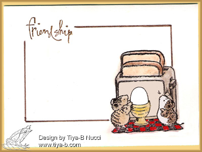 This is for 3 challanges the first Penny black Saturday challenge friendship, the mice are Penny black, the sentiment Printworks. colored with chalks and a pen frame added. This is also for Less is More Anything case goes, and One Layer Wonder color it.