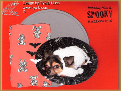 Ok I’m pretty sure I’m not the only ‘parent’ who dresses my chihuahuas up for Halloween- and a mummy costume seemed perfect! Here’s the first card I attempted… its Bella all wrapped up! The orange background(created in photo-shop elements with Pink Cat studio’s digital mummy dog) , and shapes are cut with spellbinder nesties, the sentiment is Penny Black , the bats Martha Stewart. Here’s the mojo sketches. Happy Halloween