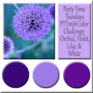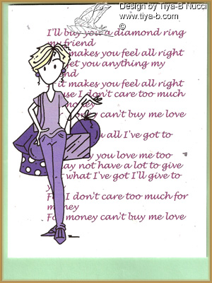 Party time Tuesday challenge today was Plumb crazy – useorchard violet lilac and white. Here’s a digi I wanted to use and sorry… don’t know where i got it… its labeled girlshop(couldnt find it on the web using girlshop digi, darn). I then couldn’t think of what sentiment to use and Sara suggested to use the lyrics to cant buy me love… it fit.