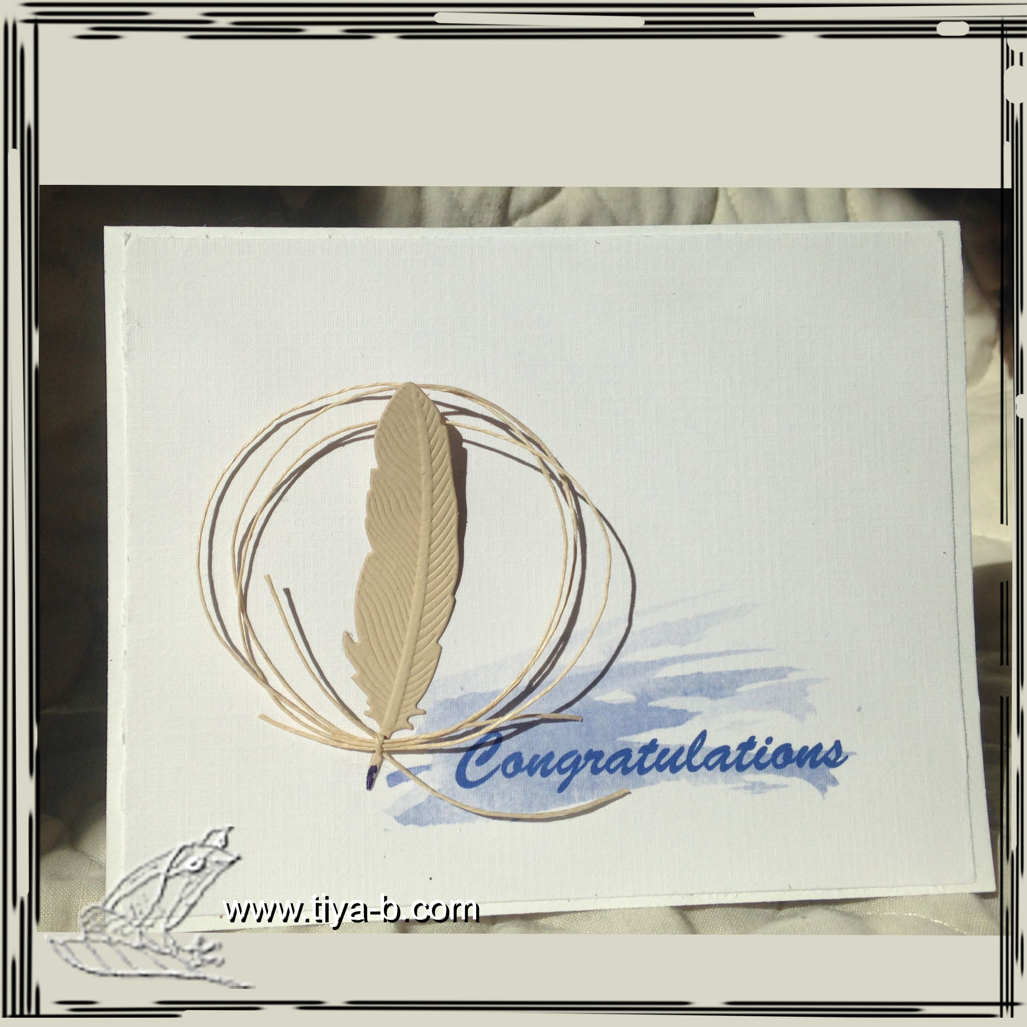 This morning the Less Is More blog is celebrating it’s 200th challenge. So here’s a celebration card. I printed the congrats and then used a spellbinder to cut and emboss a spellbinder feather, added twine circles, and colored the feather tip blue before gluing it to the card. Congratulations ‘Less is More’, my favorite card challenge.