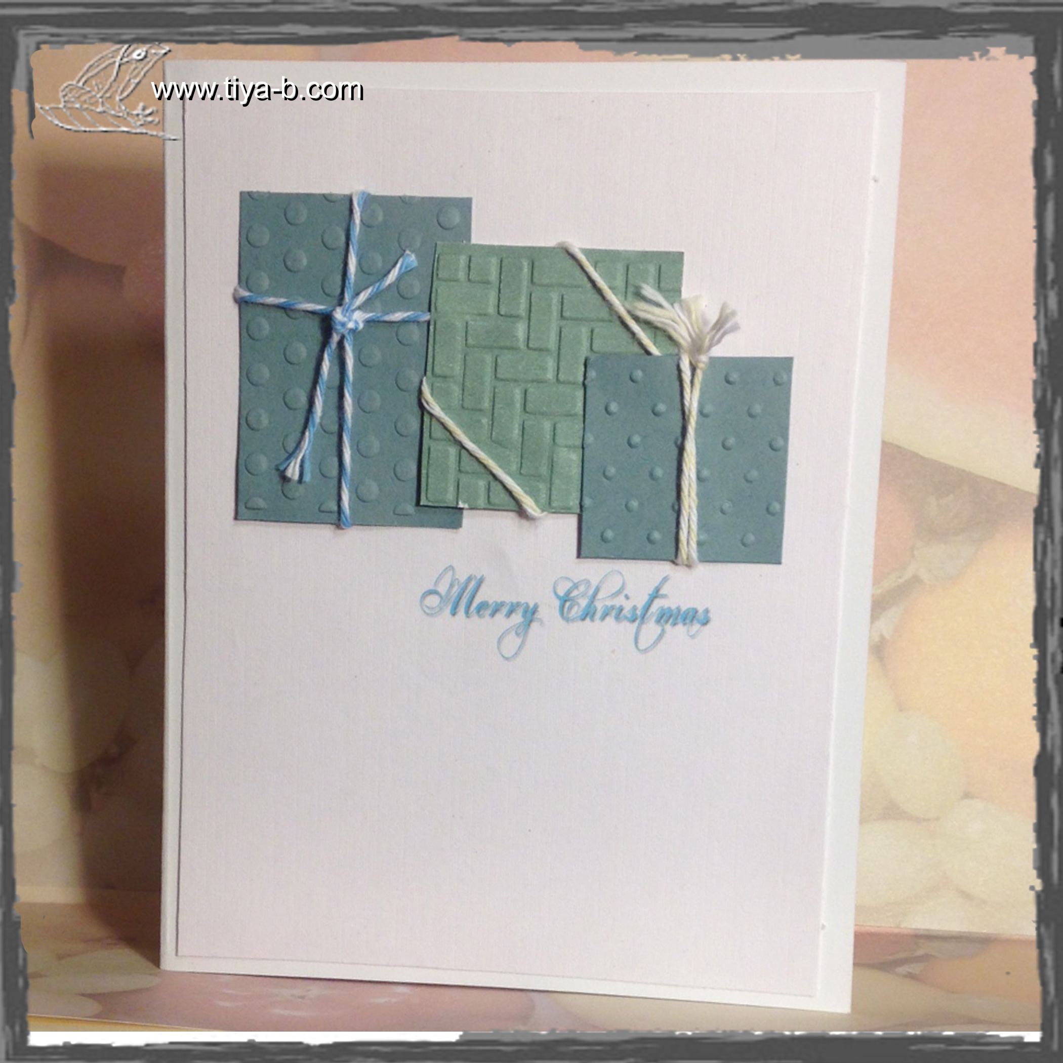 this is my weeks entry for Less is More. I got this idea from a Pinterest card from StampingwithLoll.com but can’t find the post. The sentiment was printed on the card , then embossed presents with string added. i will also enter it into the AAA card game Blue, blue, blue Christmas.