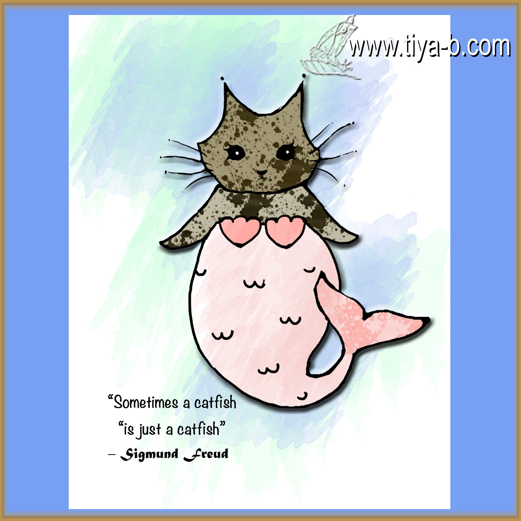 The A Day for Daisies theme this fortnight is make it Art Journal~y! so here’s my attempt, using one of ADFD ‘s new catfish images. The quote was grabbed off the web while looking for catfish quotes, but i can’t believe Freud really said that….( think it was just about cigars). I think this kittyfish is sooo cute she makes me happy so I’m entering this in the Less is more challenge This makes me happy!