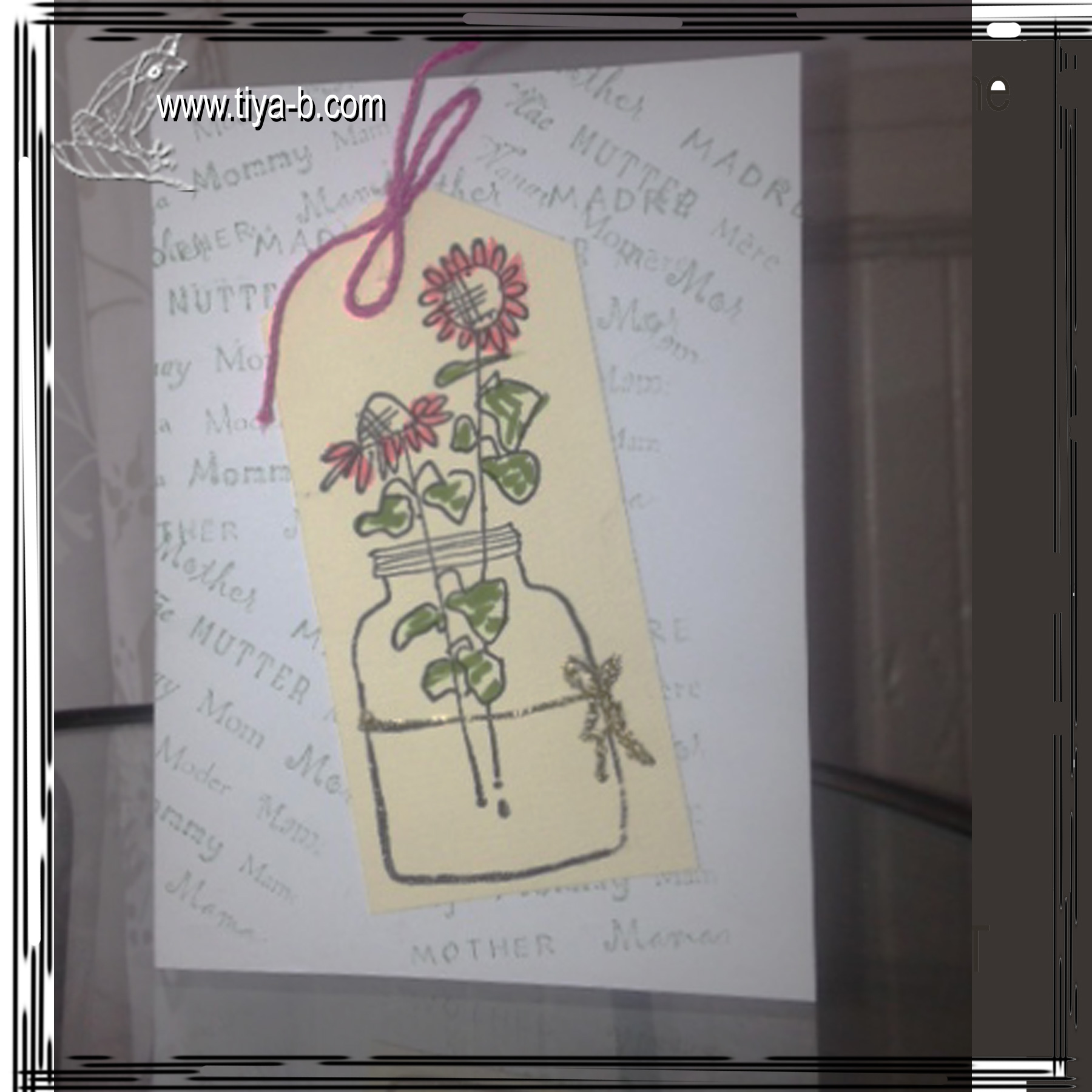 This week’s Less is More recipe is -use a tag in your project , so here’s a cream colored tag with a jar of flowers, glued over background ‘mother’ in many languages.