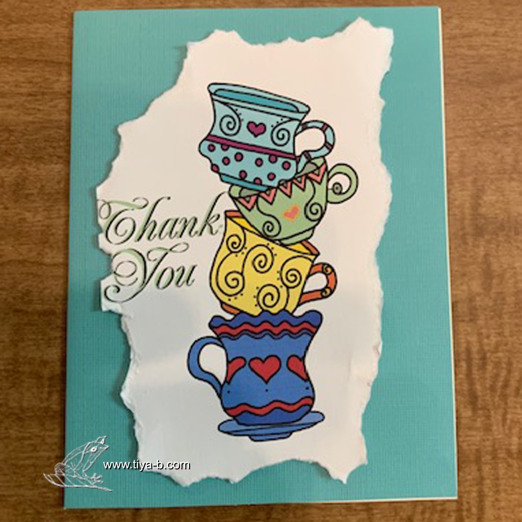 I need to make a few thank you cards and enter the Less is More ‘Thats Torn it ‘ , and the Casology ‘Appreciate ‘ challenges, then I choose my new stacked teacups , colored and printed the cups then tore them out and pasted to turquoise card stock for my new thank you cards.