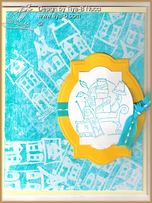 Mom needed a house warming card for Carol. The stamps are from Stampin up. The background is stamped with microglase then over stamped with an ink pad( kind of resist inking). I then stamped the furniture cut it with a nestie then cut a frame out of the bigger nestie. added a ribbon finishes the card.