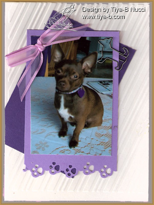 The Less is More challenge was to use metal and Stamping b’s design use a clip, so I decided on a cute dogie paperclip on a picture of clue. the stripes on the white are cuttlebuged, added background paper an EKsuccess border punching paws and a bow..just right or too much?