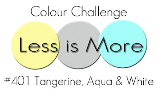 The Less is More this week is the colors tangerine aqua and white, so iI grabbed my Gracielillidesigns wildflower bouquet stamp and used those colors, and a little green for the leaves, and yellow for seeds.