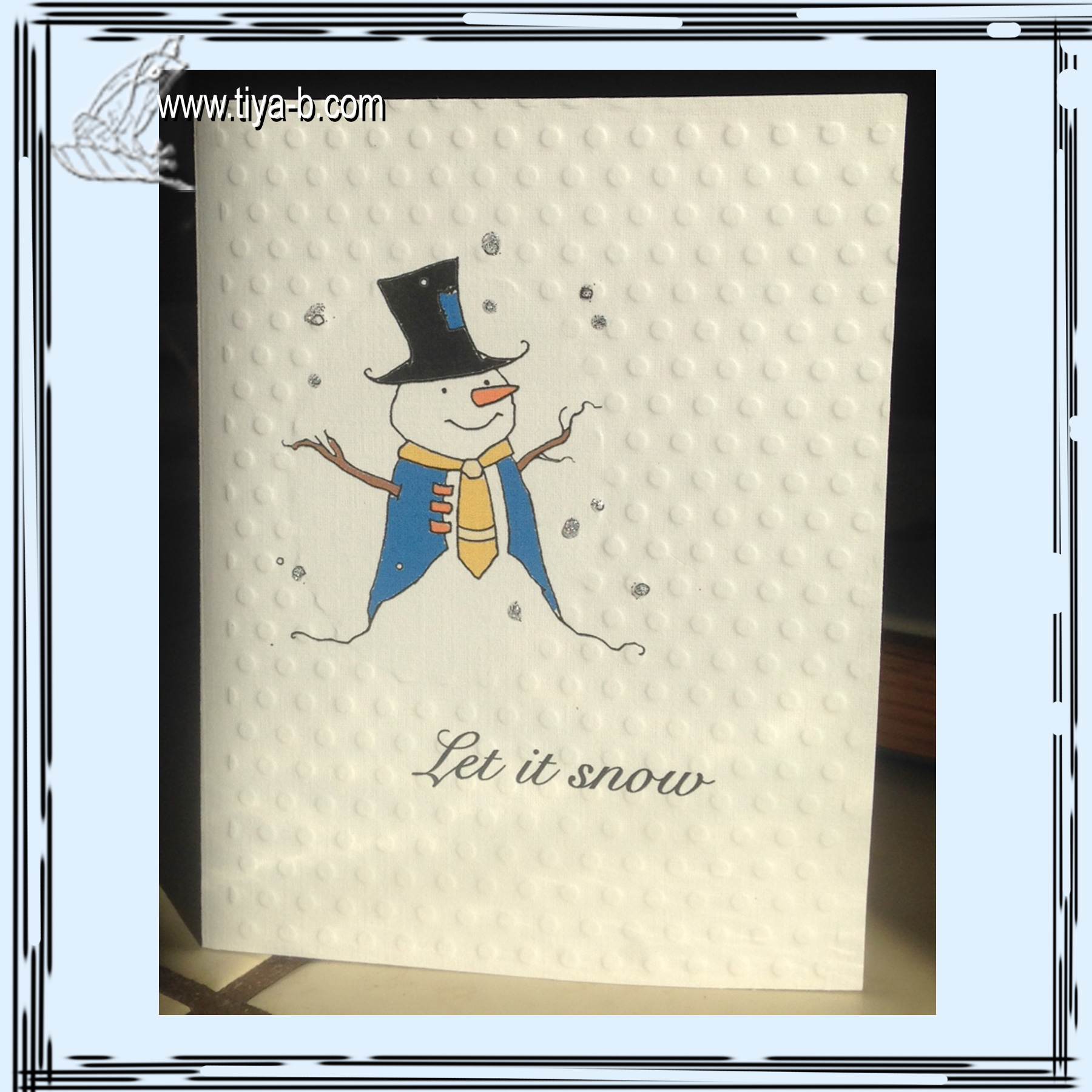 The Less is More challenge today is a Christmas card with no red or green non traditional colors The image is from a day for daisies mounted on craft cardstock with a white embossed polkadot background and a bow its hard to see in this picture… i put some glitter spots on the falling snow.