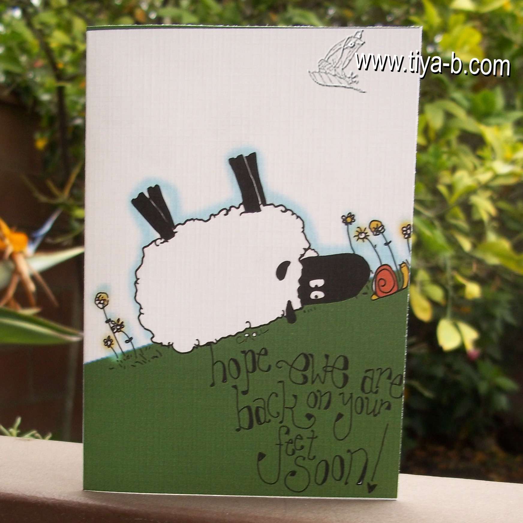 Today I made a get well card with this weeks Less is More sketch challenge… The cute digi image is from Tiddlly inks. The sentiment us ‘ hope ewe are back on your feet soon!’