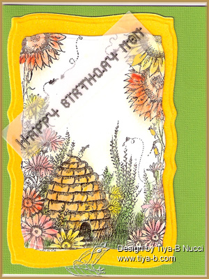 I said I’d do another bee birthday card for mom since the first one was a day late… here it is… cant read the stamp co. I used a set of nesties to punch the image notice the frame is on a glitter paper. I typed the happy birthday mom in a buzz bee font on velum and pasted it on… guess what ? I colored the flowers and bee hive with…. yes chalk. the challenge is cupcake inspirations…