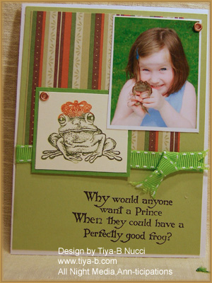 Well , this picture of my grand niece Delaney is the perfect forg picture so here it is. The frog is All Night Media nd the words are Ann-ticipation, the frog stamp was colored with Marvy olive green and pumpkin pens then stamped on watercolor paper. I added green and brown striped background paper, brass eyelets and a green stitched ribbon.