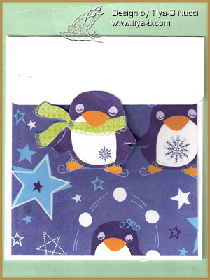 Not much here i used dcwv paper fro the background and cut a penguin out and pasted on card stock for the closure. cute and simple!