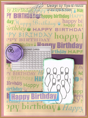 I needed a sketch for some bowling images and the Tuesday Morning sketches, see below, was perfect… I got some bowling images from a website called kalodesigns.. for Delora’s birthday… played with the size and number of imnages in photoshop elem3ents then printed them cut them out and chalked the ball and edge of the pin image.. the paper is dcwv I bought form a craft store bin. I left out the left hand dots ca8use the hb is so busy.