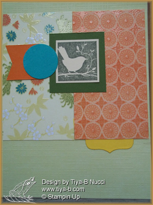 This is a new Stampin up set ‘Of the Earth’ and I usually can’t seem to use silhouette stamps but I love the bird/leaf combo, the background papers are form a slab called the Cafe Mediterranean.