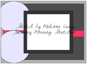 This is my first card in several days and it’s for two challenges- Tuesday Morning Sketches and Penny Black Saturday challenge. The design is Tms (sketch follows) and the colors and butterfly Penny Black. The background papers are from a DCWV latte stack. As usual the butterfly and frame are cut with two spellbinder nestabilities.