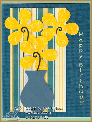 The Tuesday Morning Sketches challenge was handmade flowers and I made one but it stuck out farther than iI like on that card so decided to go with punched flowers, vase and swirls added a background paper and an embossed happy birthday-easy yes pretty too. KISS(keep it simple sweetie).