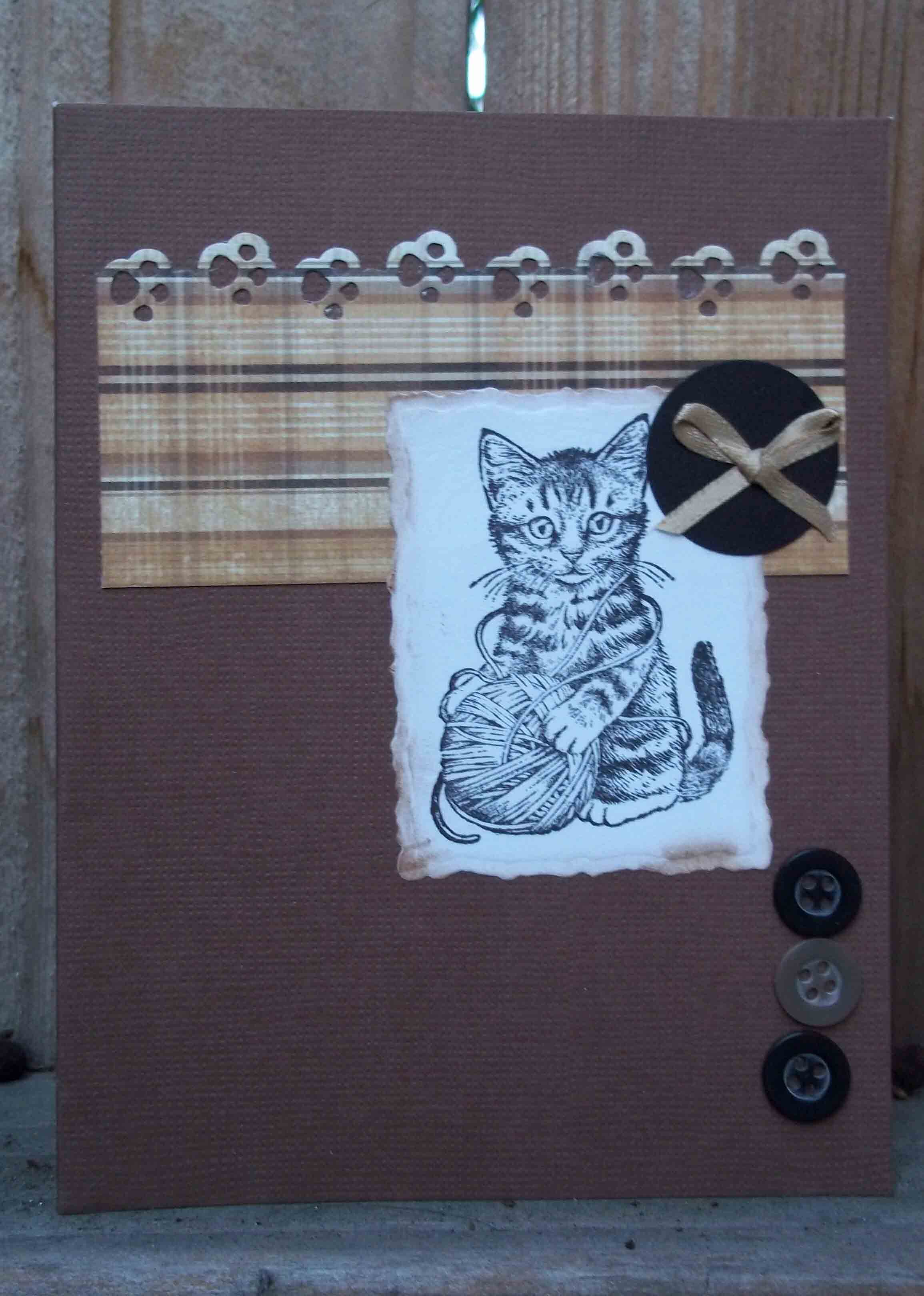 Haven’t done a cat card in a long time so here is animage from Inkadinkado. I got to use my EK pet paws punch that looks like a cartoon (not enough toes) foot ! Today a cat print. The cat image cut/embossed with a nestie. a ribbon and buttons complete the card.