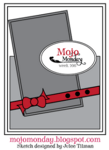 Two in one day… I’ve been lazy so just catching up. this Christmas card is for Mojo monday yesterday and Everybody art challenge yesterday too.. so with my Tuesday morning sketches earlier today I think I’m caught up for this week. the sentiment is Hero arts, the ornaments spellbinder. the background paper dcwv stack,,, mojo 166 sketch follows