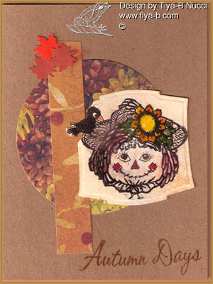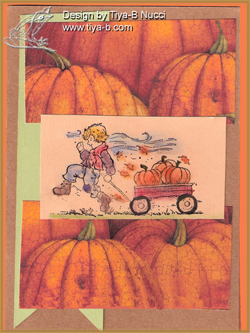 This is for Mojo Monday and Stampacular Sunday – Boy oh Boy– I love this Stampin’ up stamp colored with chalk, the background pumpkins are from a K & Company stack.