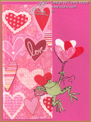 The Simon says stamp challenge is Love is in the air… how about frog is in the air? And the CAS Love ya to pieces , clean and simple paper piecing., and Raspberry delight colors from crafts4eternithy, I stamped the card after gluing on the hearts background, then stamped the frog on green, cut him out and used the Stampin up 3 hearts punch to punch the balloons form the k&c paper.. glued them on and penned in 2 more balloon strings.