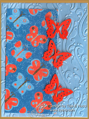 Its 3 more butterfly day… the challenges are Simon says Stamp use 3 papers and Play Date Cafe baby blue, orangesicle and basil the punch is Martha Stewart the papers DCWV and the butterfly printworks.
