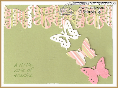 I love my butterfly punch so I crated 1 more card for Less is More – punch or die. I used my ek multi butterfly punch and the Martha Stewart border punch for the ones on top, the sentiment is Stampin’ up.