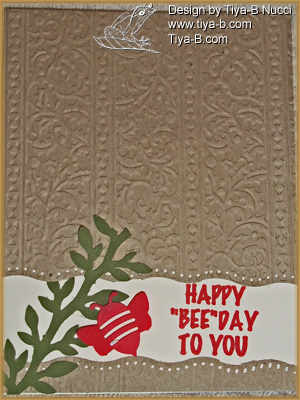 The Less is more theme is Kraft & Kreme I used a cuttlebug embossing folder for the background, added Martha Stewart punched leaves and bee and then stamped with a rubbernecker stamp… the card is cased this from this butterfly card.