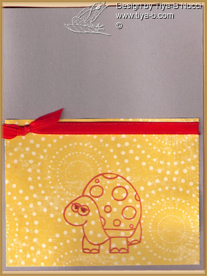 Color throwdown’s colors are gray, red saffron and vanilla… good colors for a turtle card. The turtle is from Cornish Heritage farms(and they call it a tortious). Did you see i sticlked his red eyes? This qualifies for Heart Song Inspirations – gold or glitter since the background is saffron/gold in color and the trutles eyes were(glittered) stickeled.