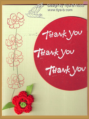 Thanks to Tuesday Morning Sketches, and this is the last Tuesday of November so its my last day as guest designer…I was to include beautiful crocheted flowers from pixie petals . and got two flowers so I made two cards… one red one purple, here’s the link to the flowers altho it hasn’t been available lately.. Pixie Petals