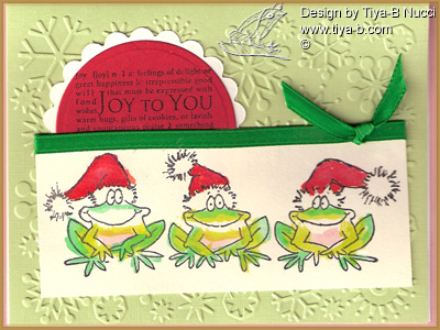 Here’s my Mojo monday entry…. Christmas frogs with a hero arts sentiment of joy. frogs are painted with twinkling h2os and the circles are cut with spellbinders. the background green cuttlebugged with now flakes.. only a few more days till Christmas